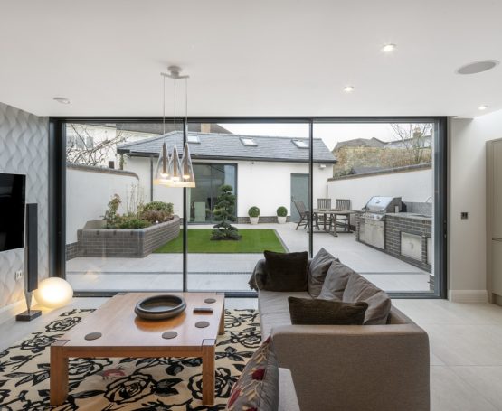 • een strakke achtergevel met veel glas richting tuin